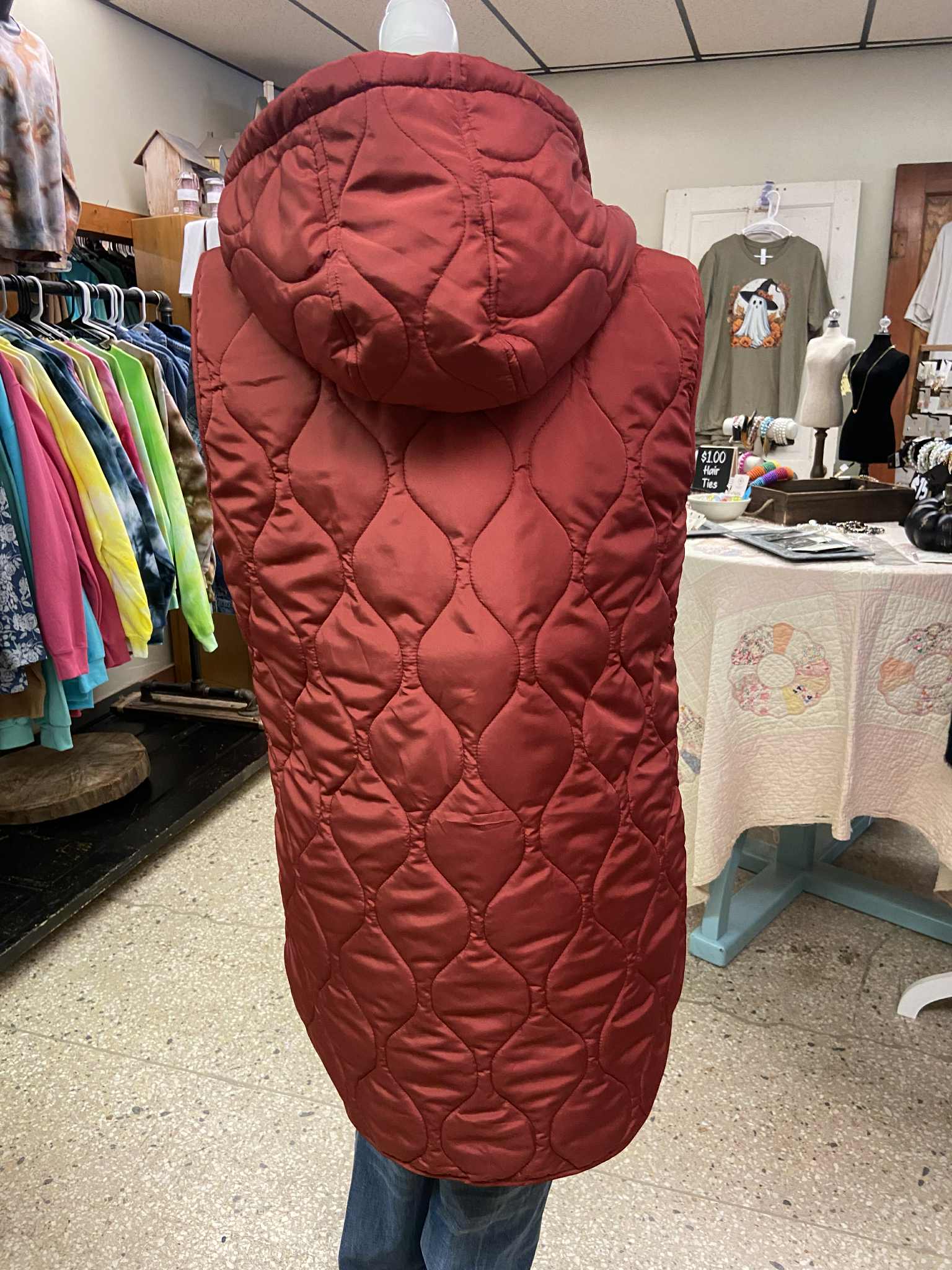 Stay warm and stylish in this long, green-colored red. It features a modern quilted detail, a full front zipper, and unique zippers on the sides for a customizable fit. Perfect for layering over your favorite long-sleeve tee.
